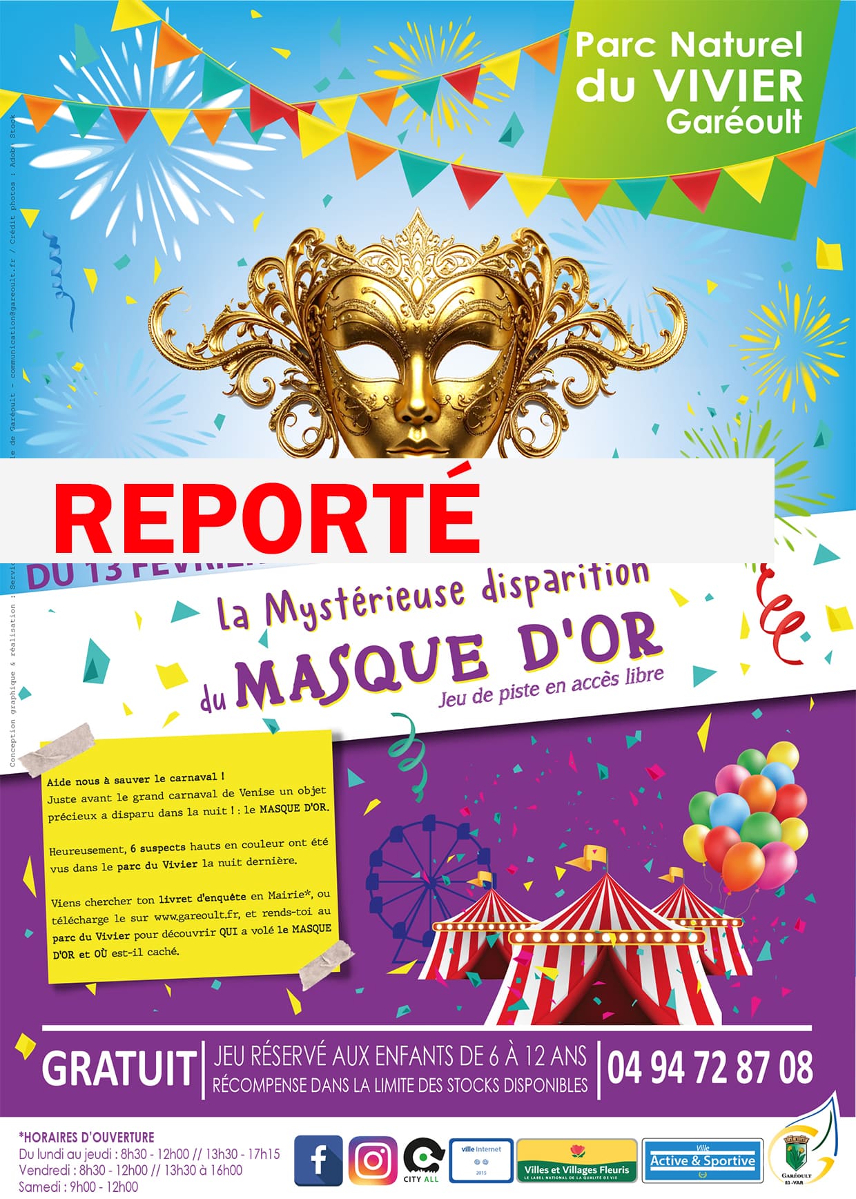 Viens chercher ton livret d’enquête en Mairie*, ou télécharge le prochainement ICI, et rends-toi au parc du Vivier** pour découvrir QUI a volé le MASQUE D’OR et OÙ est-il caché.