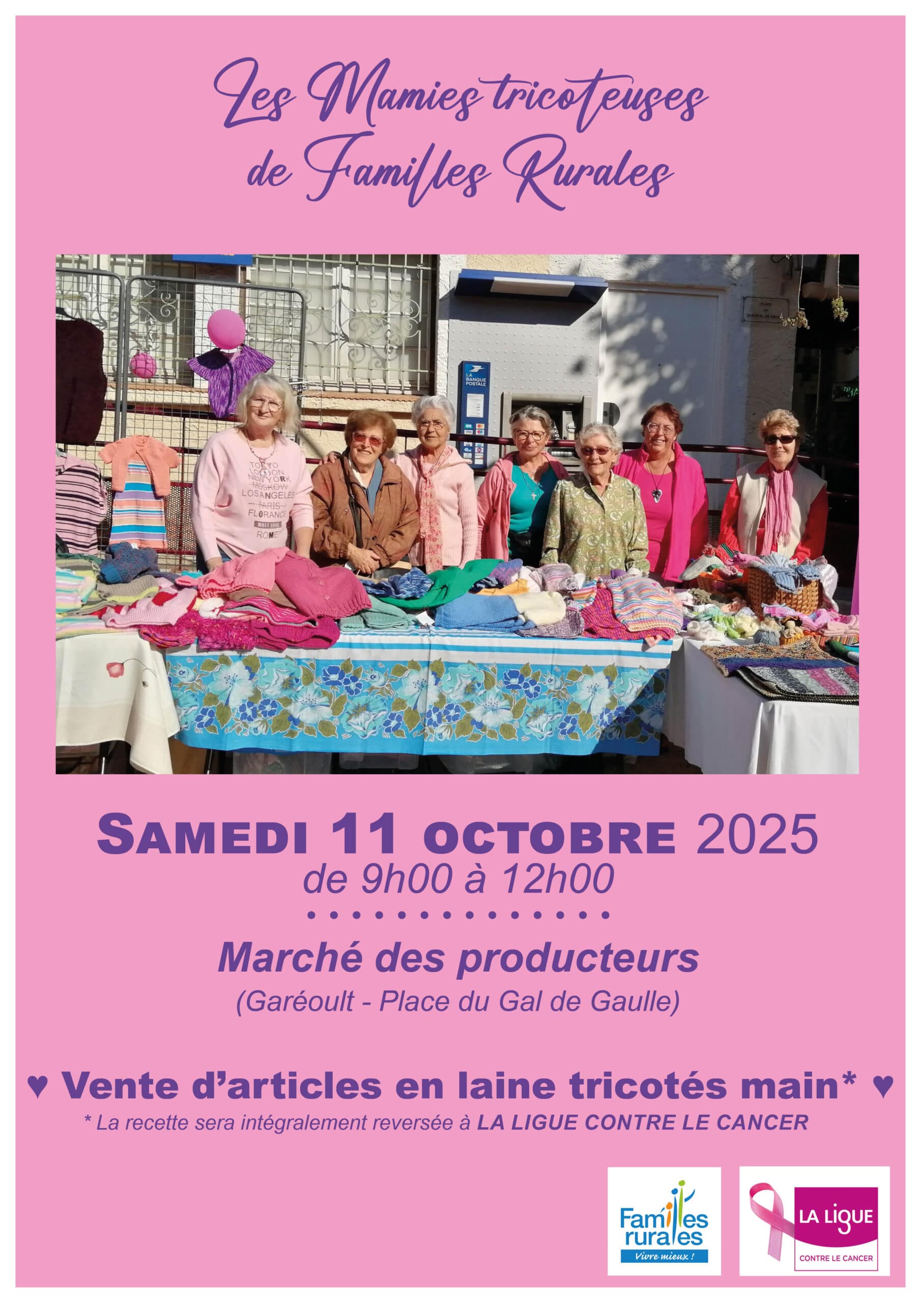 De 9H à 12H, elles seront présentes sur le Marché des Producteurs locaux (place du général de gaulle) pour une vente d'articles en laine tricotés main dont la recette sera intégralement reversée à La Ligue contre le Cancer.